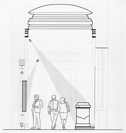 To date there have been several proposals drawn up for the more up-to-date arrangement of the lapidarium of ancient Emona in the National Museum, in which the proposers placed the Roman monuments quite freely around the interior of the exhibition and connecting corridors. The consequence of such an arrangement was the loss of viewing and access space in the exhibition area. In view of this experience, the protection of the existing space of exhibition hallways and the concomitant allocation of exhibition space represented the most important task in planning the interior exhibition. The resulting arrangement, which derives from the cladding system, is the only one which offers in equally valid form a modern display of the stones and multiple use of the appurtenant space in the building of the National Museum.