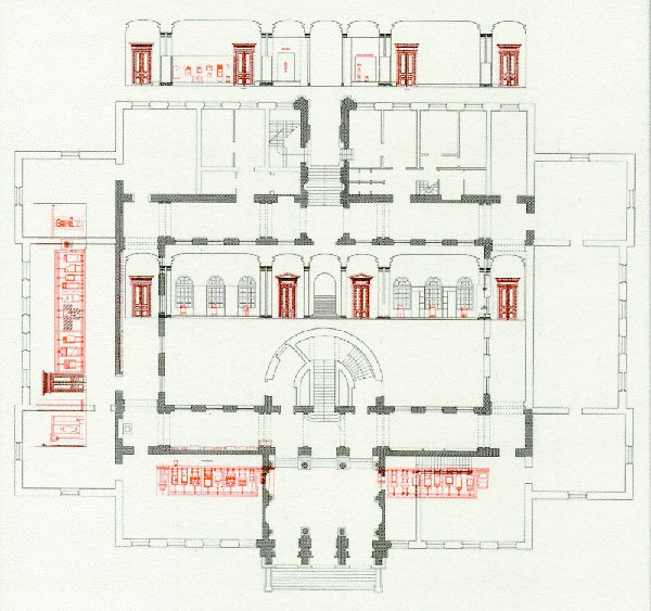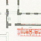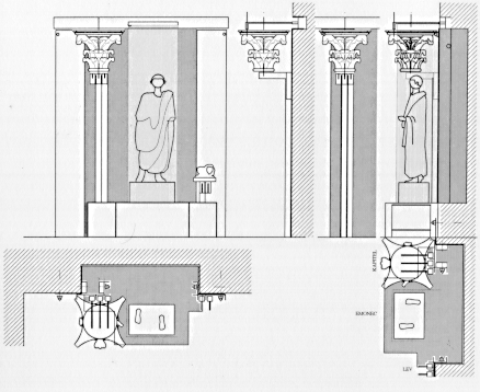 The system of cladding stones onto the wall, as employed in the first lapidarium of the National Museum, was in terms of use of exhibition space the most appropriate arrangement. This system provided for a satisfactory allocation of the narrow corridors as exhibition space for viewing Roman monuments, at the same time allowing for functional use as a corridor for other museum visitors and for employees. |
