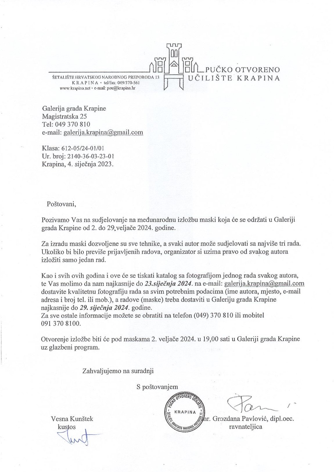 Lepo prosimo vas, da do 23. januarja posredujete fotografije za katalog izdelkov, same izdelke pa do 29. januarja dostavite v galerijo.