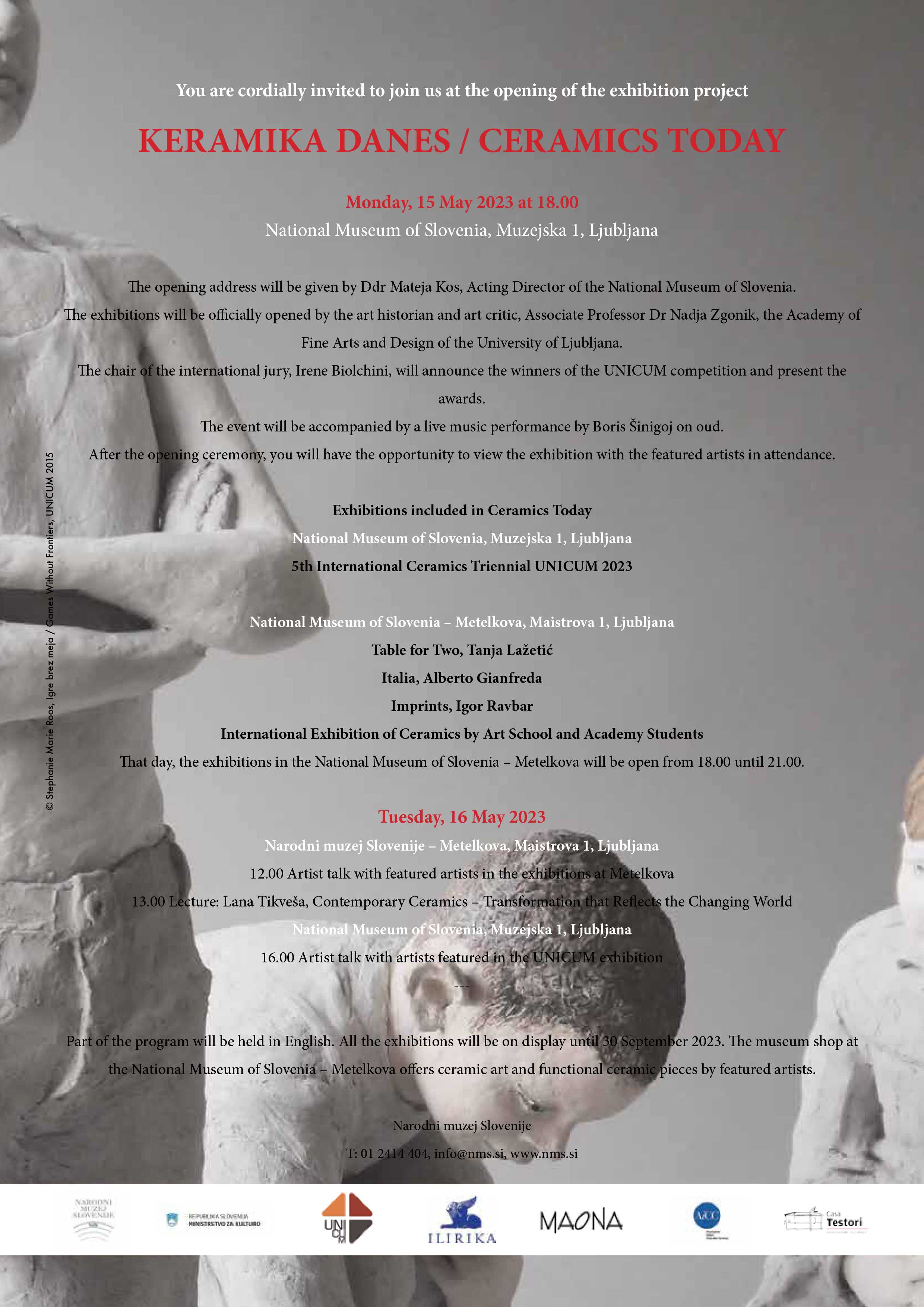 Vabimo vas na odprtje mednarodnega razstavnega projekta KERAMIKA DANES / CERAMICS TODAY v ponedeljek, 15. maja 2023, ob 18. uri v Narodni muzej Slovenije, Muzejska 1, Ljubljana.