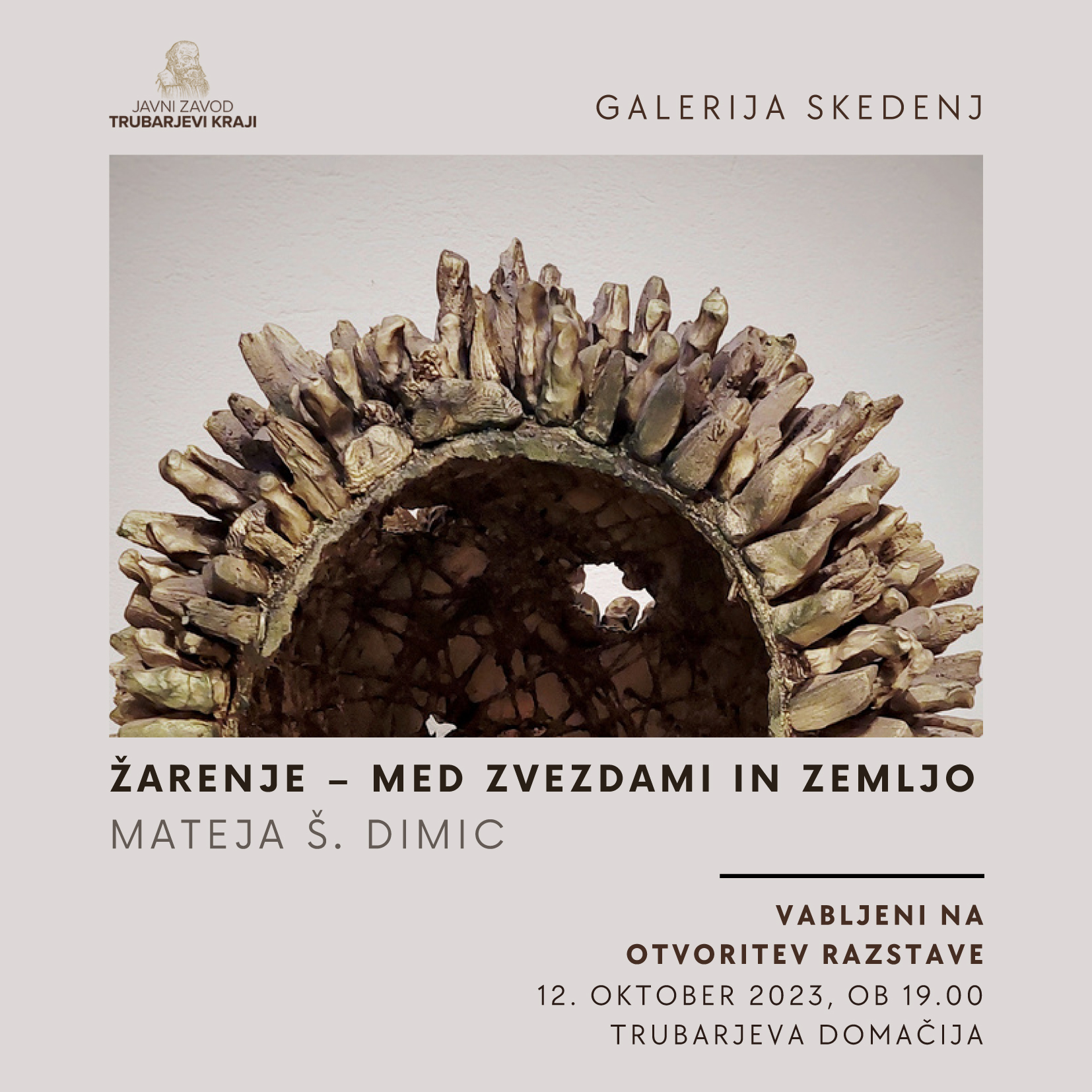 Vljudno vabljeni na odprtje razstave Dragice Čadež / Glina in les, ki bo v četrtek, 20. aprila 2023, ob 19. uri v Galeriji Miklova hiša. Razstava je del spremljevalnega programa V. mednarodnega trienala keramike UNICUM 2023.