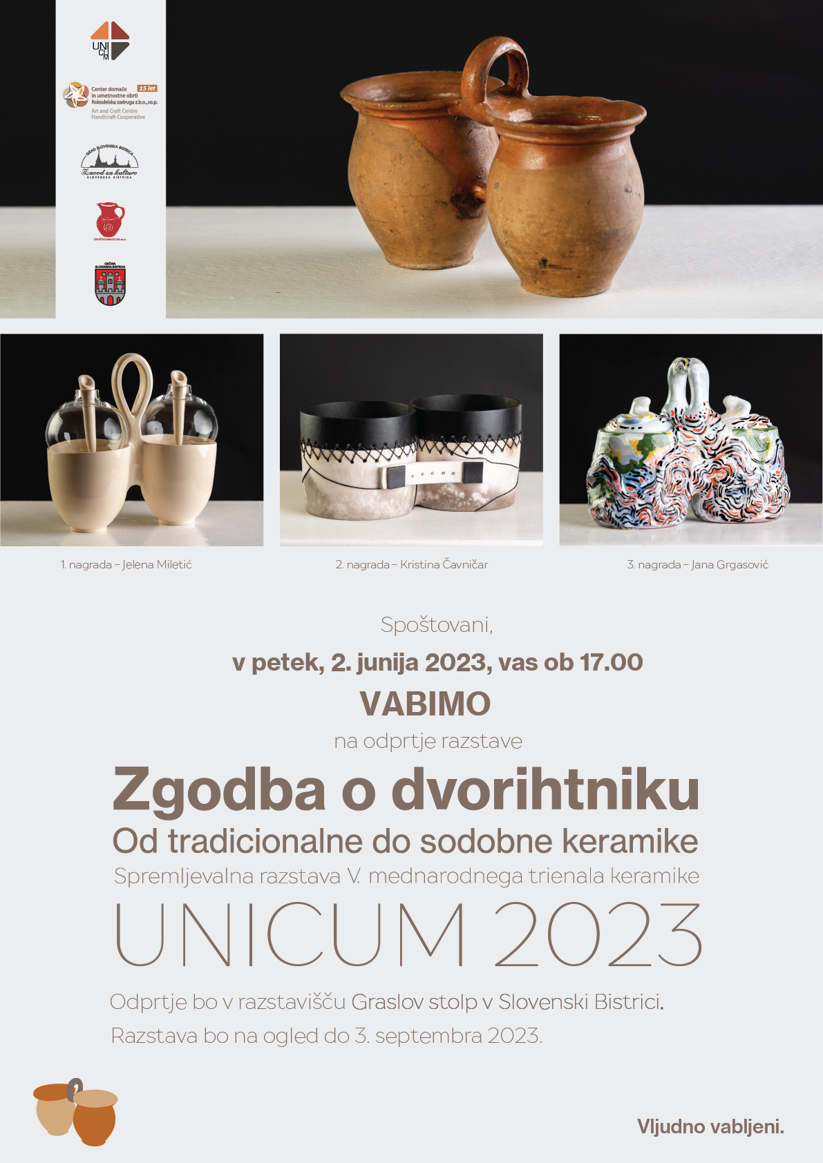 V. Mednarodni trienale keramike UNICUM 2023, ki poteka med 15. majem in 30. septembrom 2023 z osrednjo razstavo v Narodnem muzeju Slovenije, je najpomembnejša mednarodna razstava s področja sodobne umetniške keramike v Sloveniji. UNICUM je postal referenčni projekt, primerljiv z drugimi sorodnimi prireditvami v svetu, ki poleg osrednje razstave obsega tudi bogat spremljevalni program prireditev po Sloveniji. Razstava v Slovenski Bistrici je stalnica spremljevalnih dogodkov UNICUM od njegove ustanovitve leta 2009. Rdeča nit naših razstav je tradicija kot izziv sodobnemu likovnemu izrazu, zato so zadnje tri razstave tematsko obarvane s predstavitvami tradicionalnih keramičnih izdelkov naše lončarske dediščine. Po Zgodbi o skledi leta 2015 in Zgodbi o vrelni vehi leta 2018 je tokratna osrednja tema Zgodba o dvorihtniku. Na razstavi Od tradicionalne do sodobne keramike – Zgodba o dvorihtniku se s svojimi deli predstavljajo avtorice in avtorji iz Slovenije, Hrvaške in Srbije po izboru strokovne komisije, ki so vsak na svoj izviren način reinterpretirali dvorihtnik.