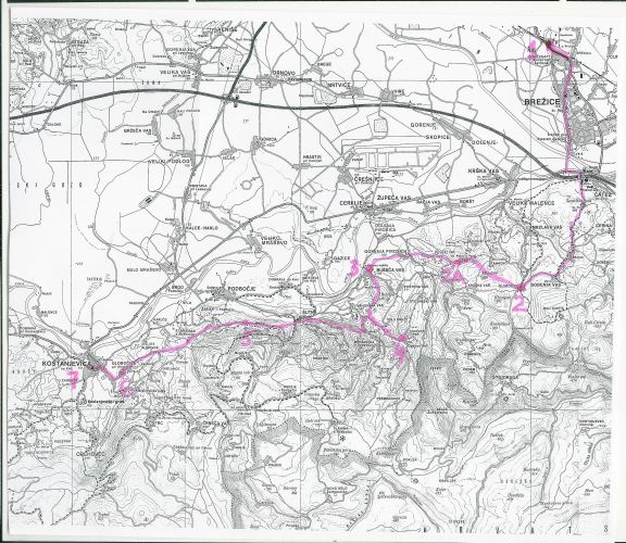 1 - Žel. postaja Brežice 2 - Globočiče, prenočevanje pri Martinu 2A - Srečanje z Vilijem, cviček 3 - Klunove toplice 4 - Gadova peč, prenočevanje Komatar 5 - Srečanje z Lekšetom, špeh 6 - kosilo v Globočicah 7 - Avtobusna postaja Kostanjevica |