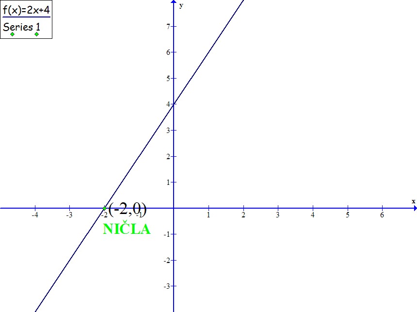 Primer: y = 2x + 4 Izračun ničle: y = 0 y = 2x + 4 0 = 2x + 4 -2x = 4 /:(-2) x = -2 M (-2, 0)