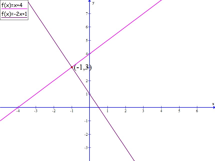 Rešitev sistema dveh enačb y = x + 4 in y = -2x + 1, ki v koordinatnem sistemu predstavljata premici, je presečišče P(-1, 3). Točko lahko prebereno iz grafa.