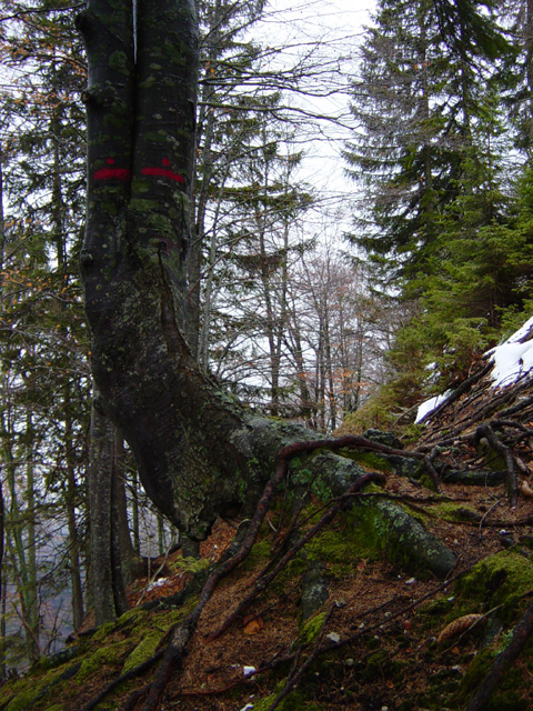 Gozdarske markacije na ostri gozdni rezi Drmalke.
