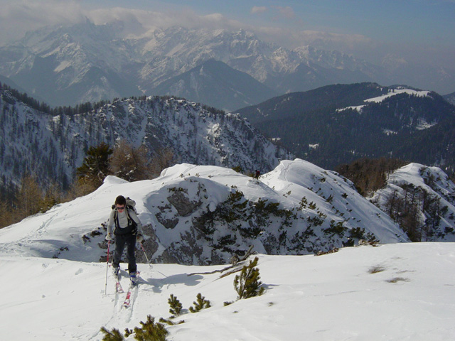 Pod vrhom. V ozadju se oblačita Jalovec in Mangart.