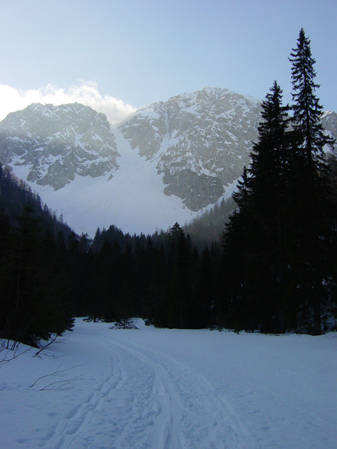 Jutranji pogled iz Medvedjega dola. Na levi Stolova škrbina s širokim Janeževim žlebom, v sredini najina željena grapa v S steni Stola.