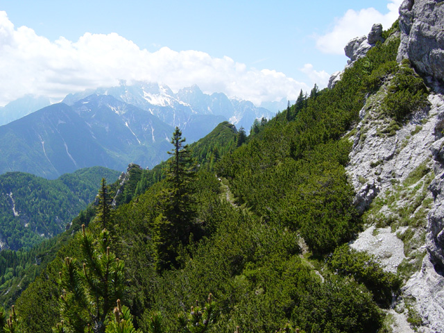 Potka pod grebenom Kurjekov, v ozadju Martuljkova skupina.