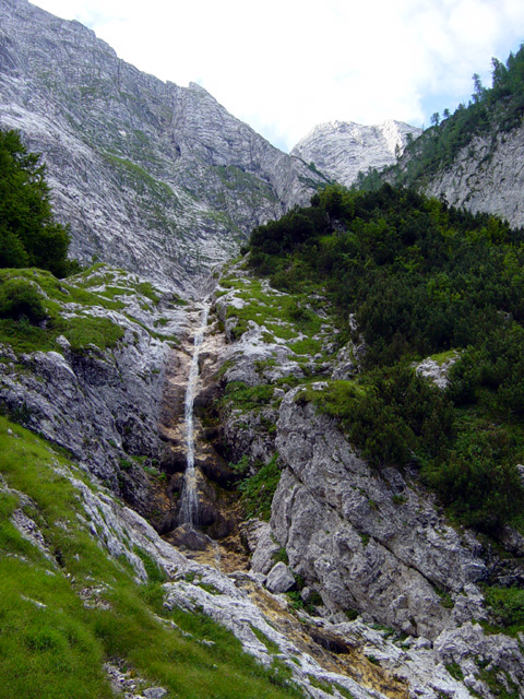 Vstop v veliko krnico nad Dolgimi plazi (zgoraj obsijana Oblica).