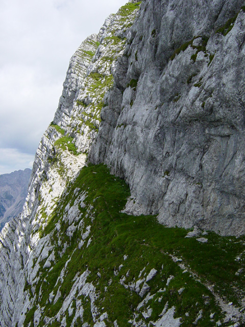 Vrtoglavo izpostavljena, a udobna (spodnja) polica pod grebenom.