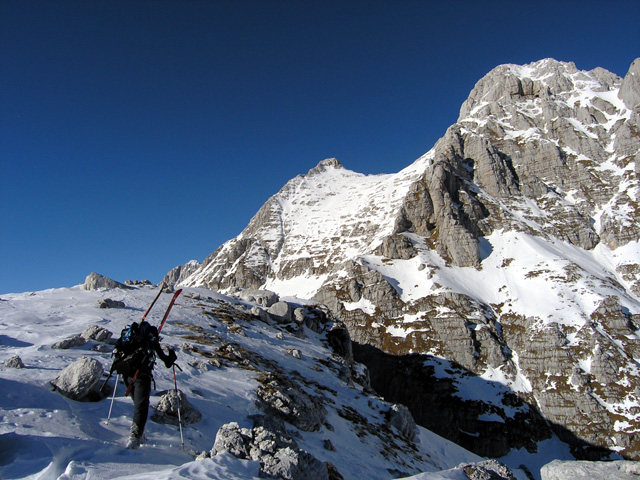 Proti Škrbini Riomoz (2159m), zadaj Špik nad Nosom in Špik nad Špranjo, vmes obsežna Planja (Sella/Sedlo Buinz).