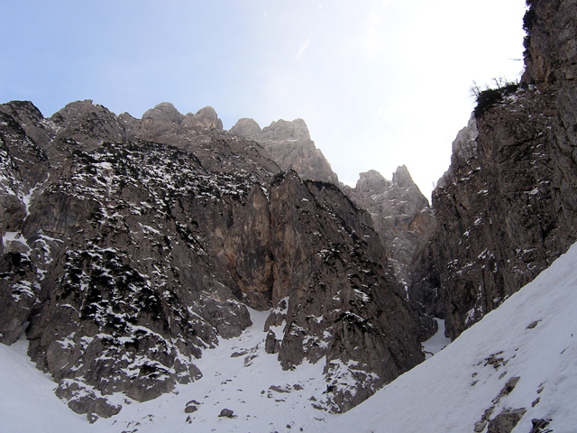 Desno Kozji žleb, nad njim Veliki stolp Kanceljnov.