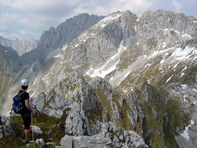 Prek Oplačnice se greben v zmernem crescendu prisloni na sedlo Vrh Osojnika (zadaj greben Pelcev).