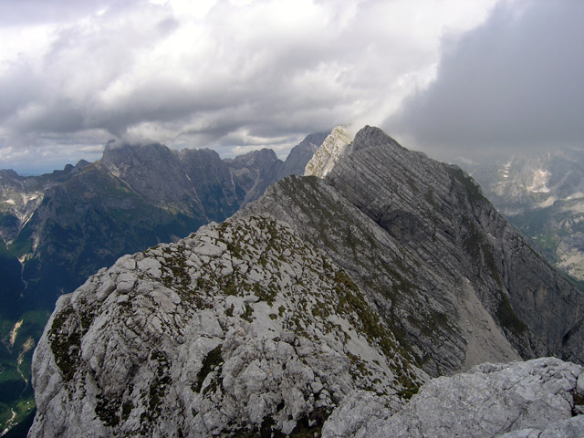 Z Vrha Krnice (Oblica, Oltarji, Briceljk - zadaj Mangart in Jalovec).