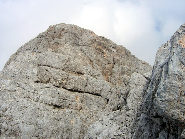 Vršna kopa Škrlatice; vmes čakajo še 'nevidni' in ostro nabrušeni stolpi.