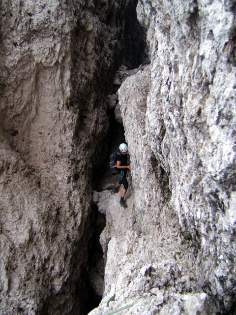 Izpostavljena polička, ki vodi iz ostre škrbine med Campanile Est in VBŠ.