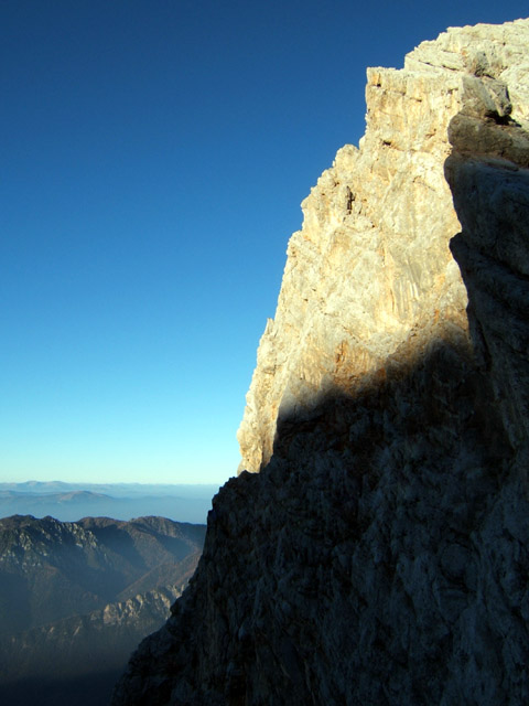 Vršna zapora s strani. Večerna Kukova špica v sestopu.