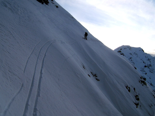Zelo sitna, izpostavljena prečnica proti Cjajnikovi škrbini, ki preči prek robov, ki se lomijo v žleb Huda jama.