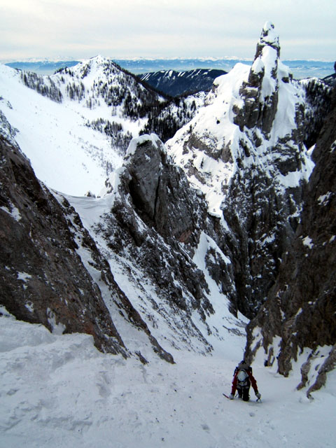 Nad prestopom (izraziti 'Plevnikov stolp', desno za robom se zgornja grapa zaključi s kar konkretnim skokom.