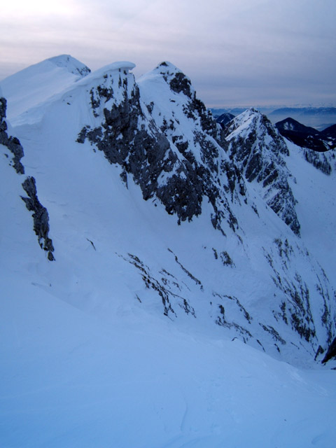 Tihotapska grapa s škrbine med dvoglavim Toplarjem (levo Veliki vrh).