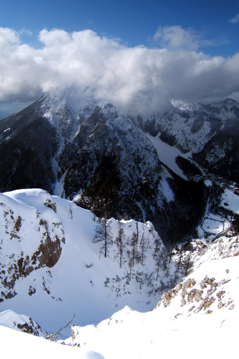 Z grebena: zadaj Begunjščica, v ospredju (v senci) vršni del Vrančka.