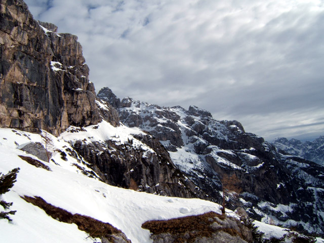 Silovita polica pod Kapno steno (Beljaški stolp), ki zelo izpostavljeno vodi v Gorenjo Krnico (koča Corsi).