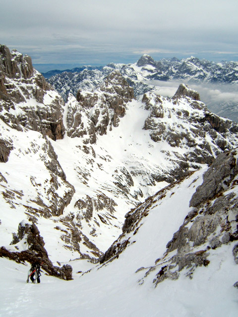 V žlebu pod vršnim grebenom (zadaj Krniška škrbina).