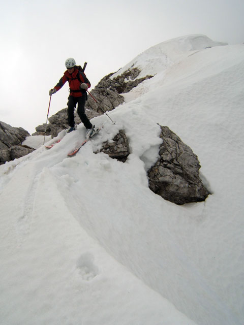 Iskanje zalitih prehodov, nežen spust po robu grebenske rezi.