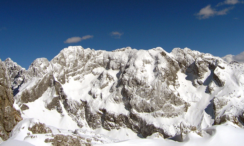 Greben Pelcev pozimi (13.3.05): dolga gredina, ki privede v krnico Klonice, nad njo Kloniški in Veliki Pelc.