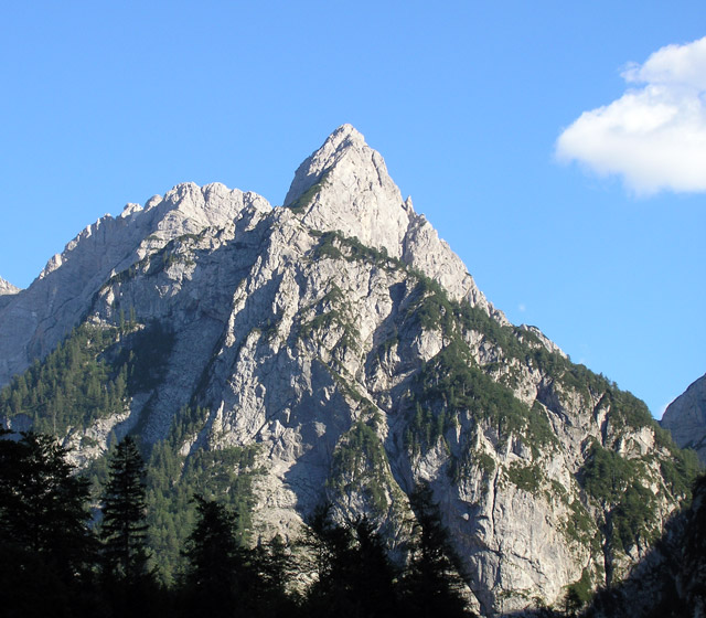 Špica Bucherja v večerni svetlobi (levo zadaj dvoglava Skala).