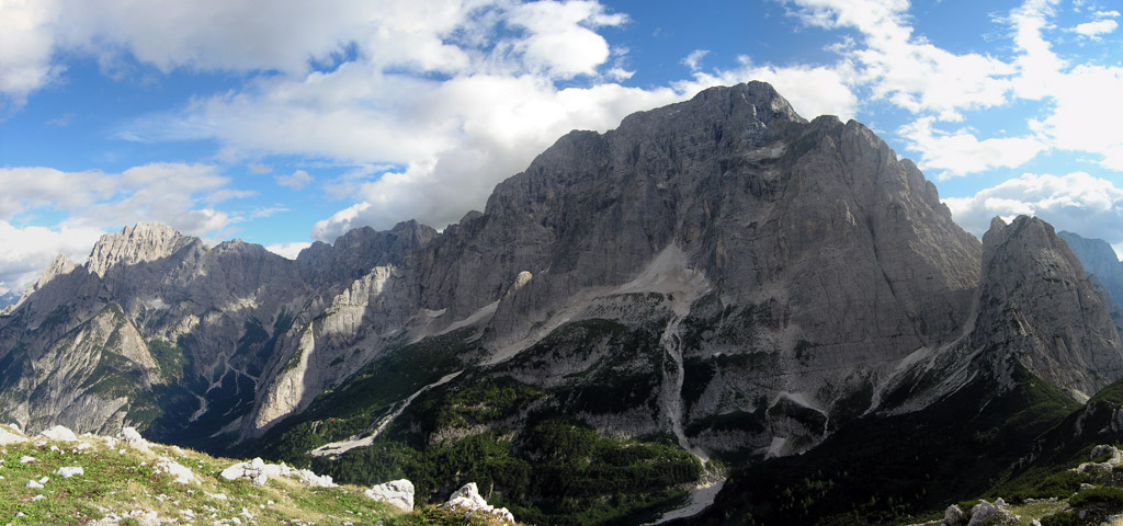 Izjemni razgled s Krniške glavice: Veliki Nabojs, Viš, Koštrunove špice, Nižnji vrhovi, Špik nad Špranjo in Špik nad Nosom, Vrh Brda, Montaž (pred njima se v soncu kopljeta greben Brd in Turn v Policah), Zmajev greben, Krnični turn.
