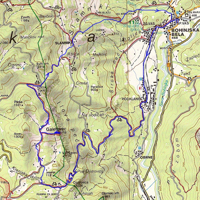 Vris ture, posebno spusta, je potegnjen bolj na približno (Bled, 1:30.000).