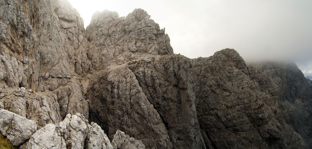 Pogled nazaj na Kugyjevo poličko z raza Krniške špice, desno Pinnacolo.