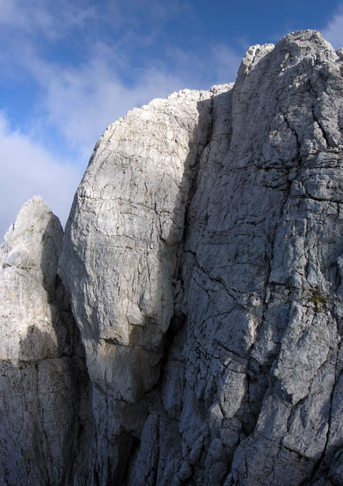 Vršni del S raza Krniške špice, s stolpa v ostro škrbino priletiš po vrvi.