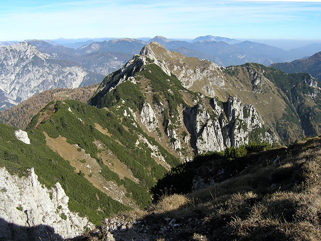 Z Dunjskega vrha: Lipnik (Monte Schenone, 1950 m) in desno sleme Laneža (poraščena grba nosi ime Clap del Jovel, 1846 m). S Pikico sva 'z druge' strani prišla na greben v škrbini Laneža.