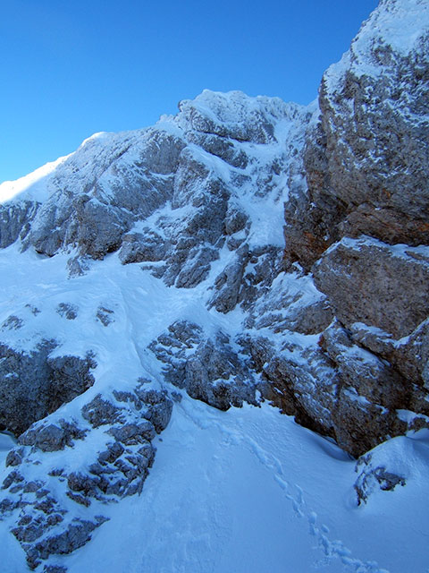 Po žlebu na desni sva splezala (bolje skvačkala) na drugo stran - po gredini na levi strani bi imela sprehod ;)