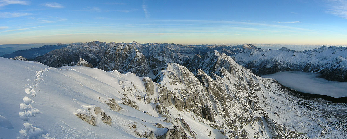 Z vrha: v ospredju Poliški špiki in Viš, zadaj Vzhodni Julijci.