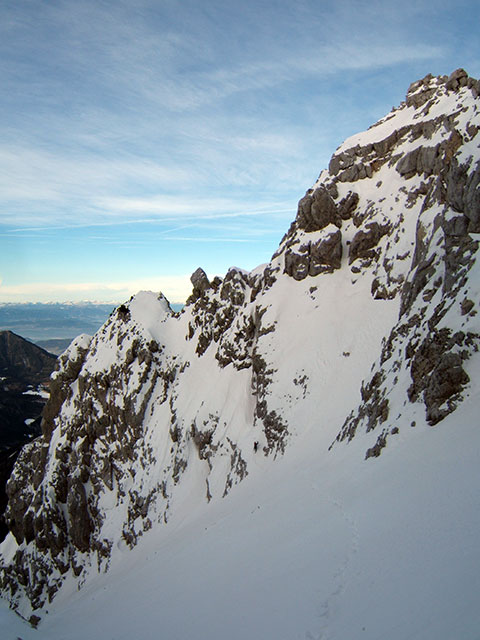 Manjca že 'pleza' izpostavljen prehod na izstop Martinega žlebu 'na drugi strani', na desni Krkotnik.
