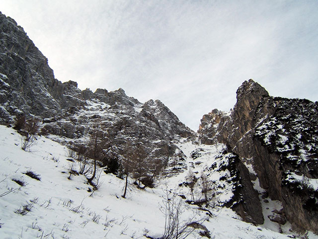 V (pod?) Tratici: levo Špiki nad Tratico, desno žleb in Špik Hude police.