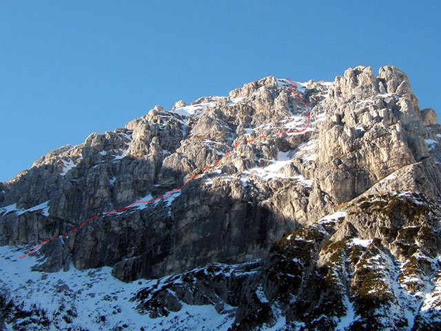 Koštrunove špice, Južna stena, IV, 500 m: po rampi desno navzgor do stolpa in po žlebičih na vršne vesine.