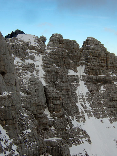 Nižnji vrhovi, 2436 m. Najvišji je srednji, najlažji pristop poteka po grebenu z leve, tik pod 'pasjim gobcem'.
