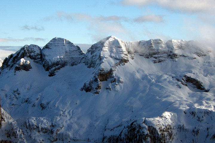 Črnelski špici in vršiča (izpod škrbine Forca de la Val, 10.02.07). Na sredini S greben Hudega vršiča.