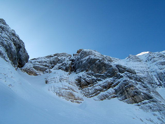 Povsem levo Findeneggov žleb, poleg po 'stebru' poteka zavarovana Julija, na desni osončen vrh Visokega Kanina.