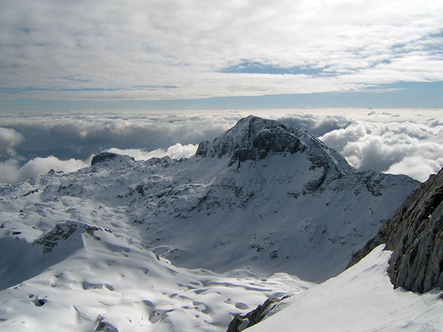 Pogled na Kaninske pode, desno Črni vogel, ki ga prerašča Vrh Laške planje.