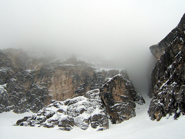 Vstop v žleb (1900 m), ki pada s Škrbine nad Plazom...