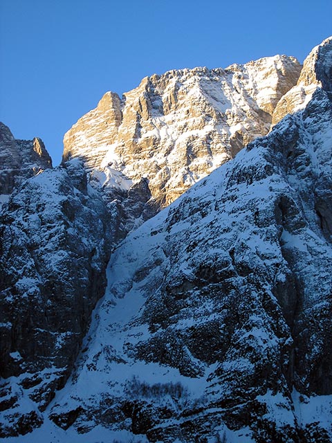 Vstopna grapa med Turnom pod Cijanerico in grebenom Brd, zadaj ožarjen Špik nad Plazom in na desni skrita Škrbina nad Plazom.