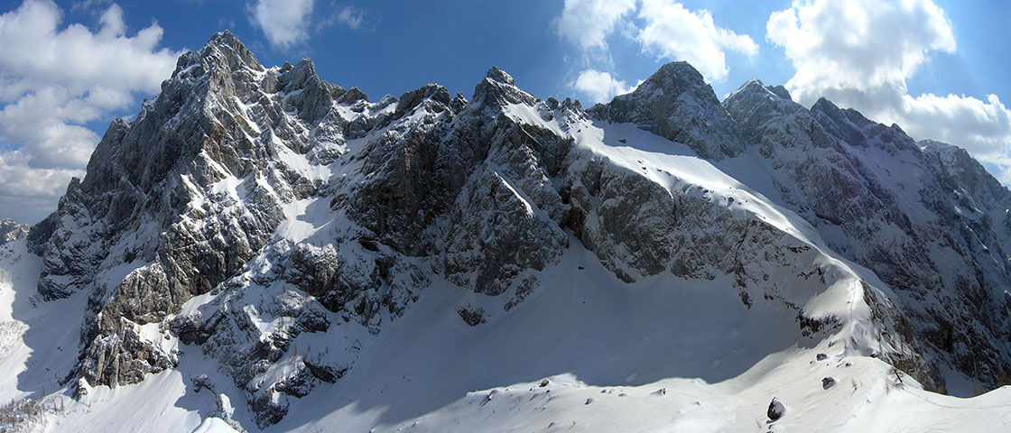 Izjemen pogled z Rjavčkega vrha: Ojstrica, Škarje, Baba, Vilice, Planjava. V sredini vesina pod sedlom Škarje, ki ponuja zelo slikovit turni smuk.