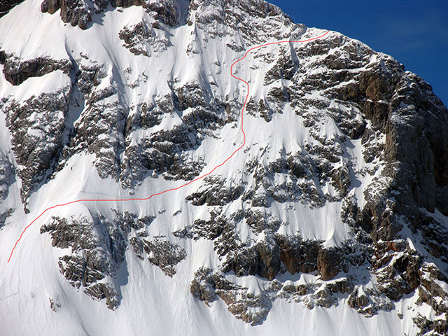 Povečava: spodnji del smeri V od S grebena, v sredini pri vzpenjanju ostrostrelsko zadeta M&M ;)