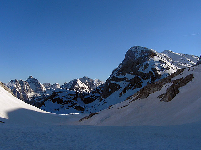 Pogled z Vrat (sedlo med Zelnaricami in Vogli), na desni predvrh Poprovec in zadaj vrh Kanjavca.